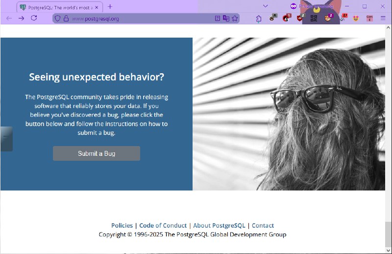 E... io ho trovato anche un ulteriore SQL Jumpscare... 2 in una serata; non me lo aspettavo, e credo che non lo desideravo. Precisamente, un PostgreSQL jumpscare: in fondo alla home del loro sito, un po' coattamente, c'è questa... vista interessante, ma decisamente non confortante. 😭 https://www.postgresql.org/media/img/misc/bugs.jpg... È, suppongo, una persona della specie umana che, con dei capelli lunghi messi davanti alla faccia, e degli occhiali da sole sopra ai capelli che coprono anche gli occhi, dovrebbe rappresentare un bug, cioè un insetto, ma un insetto nel codice del loro software??? A-ssu-rdo... anche perché a me sembra più un Bigfoot che un insetto, ma ok. ☠️ Per giunta, con la finestra dimensionata a metà tra lo stretto (breakpoint smartphone) e il più largo (breakpoint desktop), questa immagine non appare... e ciò decisamente amplia le vibe di mistero. (Ok, no, questo non è vero; anche le altre immagini decorative sulla pagina subiscono lo stesso trattamento.) Stammc accort... 🙀 source