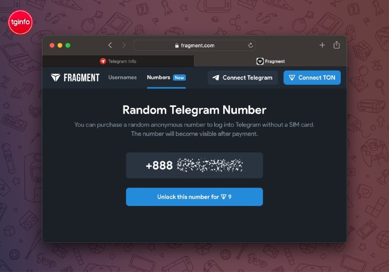 Registrati a Telegram senza una scheda SIM fisica Puoi registrare un account Telegram senza una scheda SIM fisica utilizzando numeri anonimi, la cui proprietà ti verrà assegnata tramite un NFT. Pagando una volta, l'utente sarà proprietario del numero fino a quando non vorrà metterlo nuovamente all'asta. Puoi acquistare tali numeri sulla piattaforma Fragment; un numero casuale costerà 9 TON (circa $ 16). Un numero ottenuto casualmente può anche essere messo all'asta, come puoi fare con i nomi utente. #TON