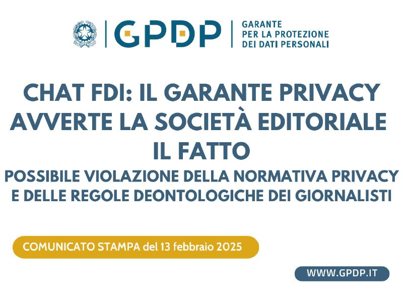 🔴Chat FdI: il Garante privacy avverte la Società Editoriale Il Fatto Possibile violazione della normativa privacy e delle regole deontologiche dei giornalisti ➡️ https://www.garanteprivacy.it/web/guest/home/docweb/-/docweb-display/docweb/10103263